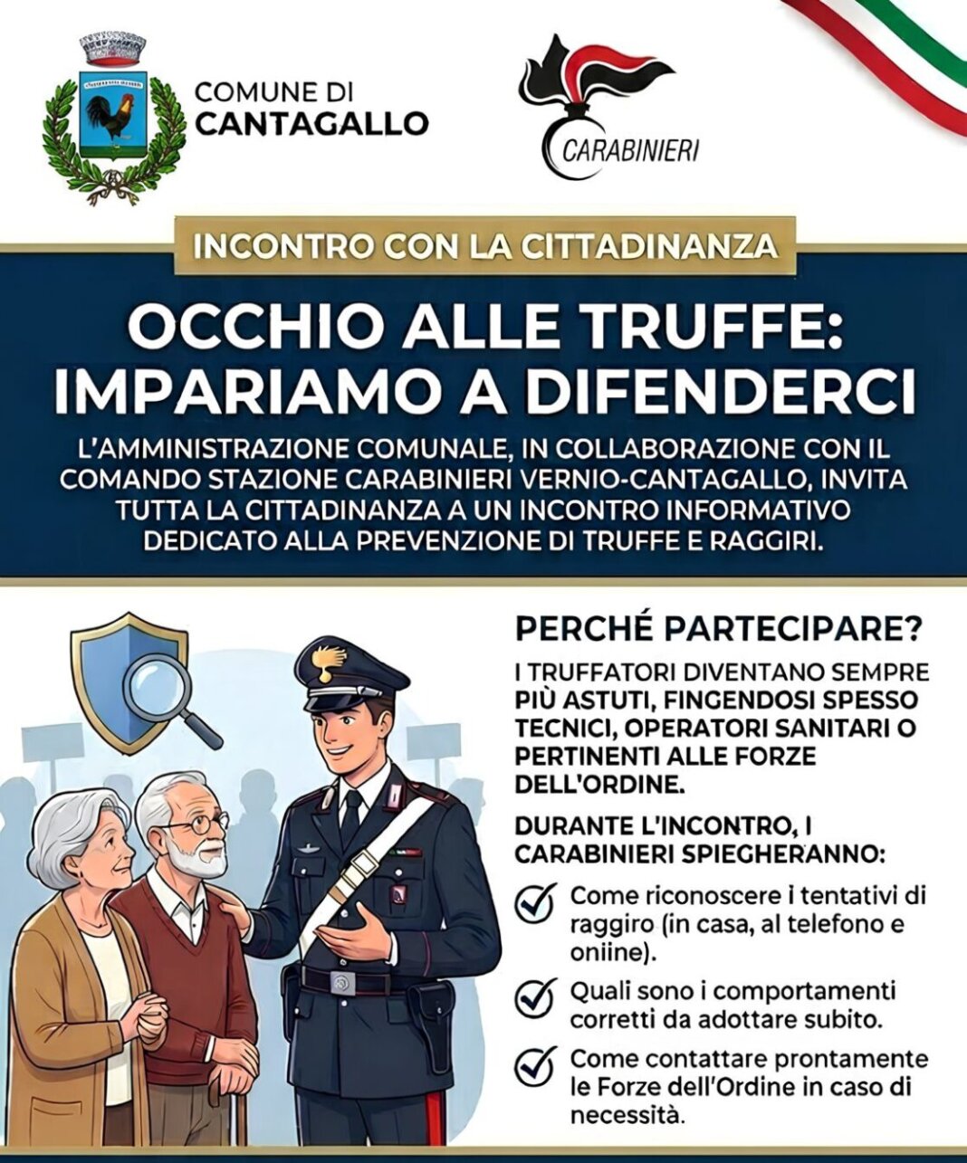 Per questo il Comune di Cantagallo, in collaborazione con il Comando stazione Carabinieri Vernio-Cantagallo e la Parrocchia di Usella, promuove un incontro pubblico dal titolo “Occhio alle truffe: impariamo a difenderci”, rivolto a tutta la cittadinanza ed in particolare alle persone più esposte ai tentativi di raggiro.