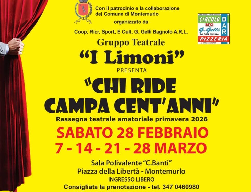 MONTEMURLO – Torna il teatro amatoriale a Montemurlo con la rassegna primaverile “Chi ride campa cent’anni”. L’iniziativa, organizzata dalla Coop. Gino Gelli Bagnolo. e dal Gruppo Teatrale “I Limoni” con il patrocinio e della collaborazione del Comune di Montemurlo, porta in scena la gioia delle commedie delle compagnie teatrali locali, sempre seguite ed apprezzate dal pubblico.
