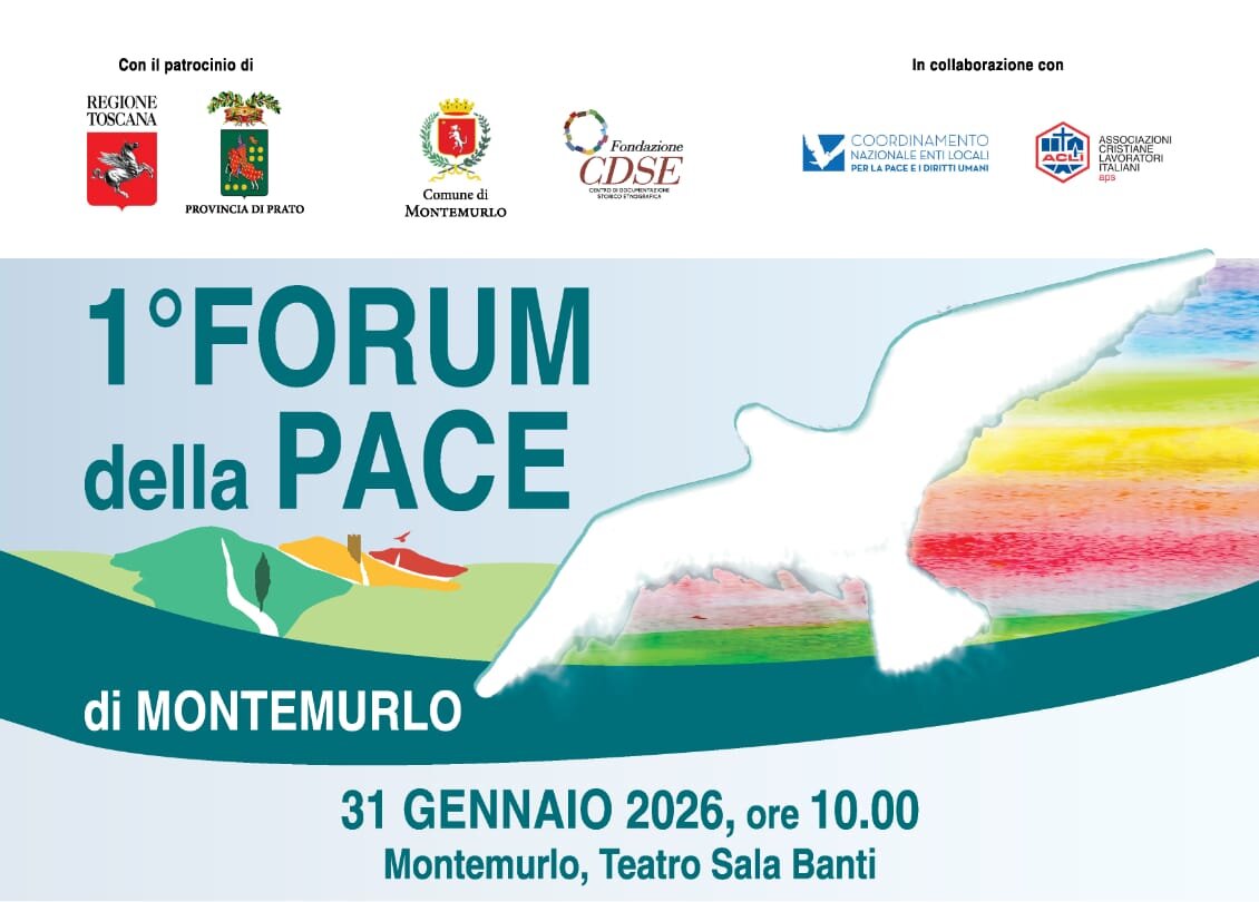 MONTEMURLO – Sabato (31 gennaio) alle 10 il teatro Sala Banti di Montemurlo ospiterà un evento di grande rilievo, il primo Forum della Pace di Montemurlo. L’iniziativa promossa dal Comune di Montemurlo, ha il patrocinio della Regione Toscana, della Provincia di Prato e del Comune di Montemurlo e nasce come un momento di riflessione sulle sfide globali e sulle prospettive di disarmo e dialogo. Il Forum vedrà la partecipazione di autorevoli esponenti del mondo istituzionale, dell’associazionismo e del giornalismo, chiamati a discutere i temi caldi della politica internazionale e dei movimenti civili per la pace.