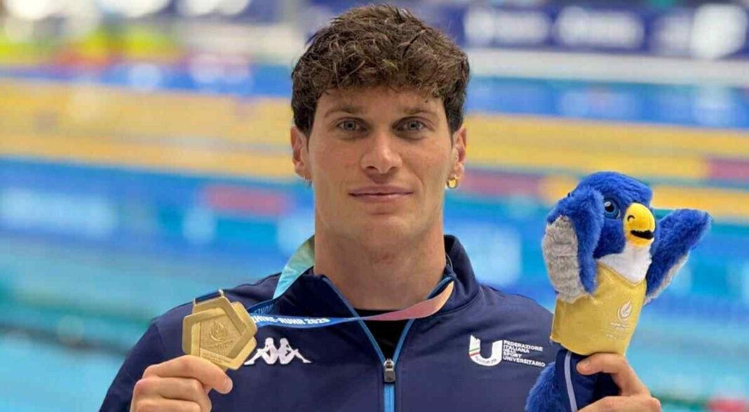 Un momento di festa per Gianmarco Sansone, il nuotatore medaglia d’oro nei 100 metri farfalla alle universiadi di Berlino 2025 che, nel suo palmares, vanta nel 2023 la medaglia d’oro nei 100 metri farfalla ai campionati italiani e nel 2024 la medaglia di bronzo ai mondiali di Doha (staffetta 4×100 mista maschile).