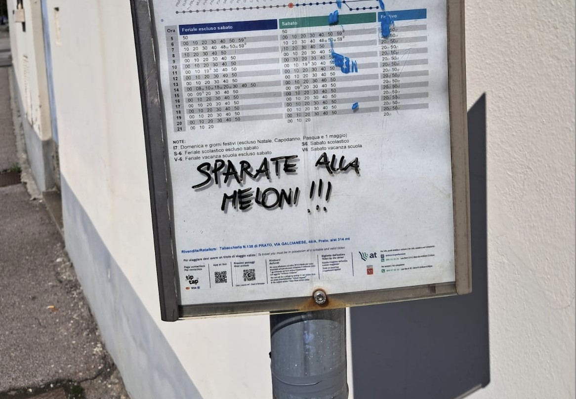 PRATO – “Sparate alla Meloni”: è la scritta comparsa alla fermata del bus di via dei Palli a Prato.