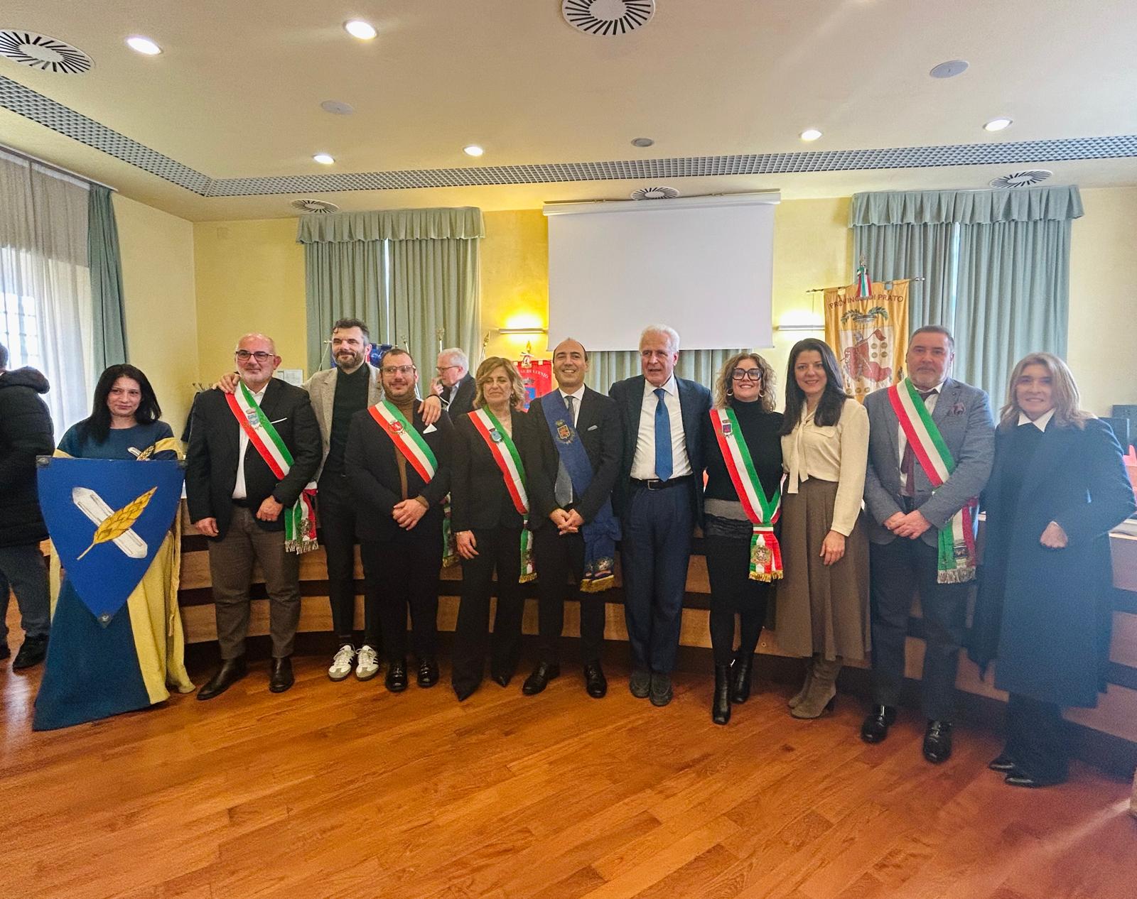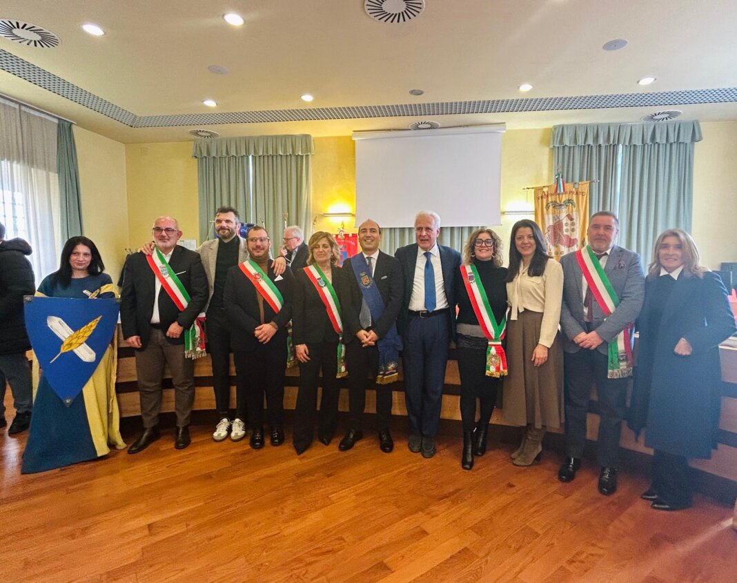 Alle spalle delle sedute dei presidenti, i figuranti in costume storico hanno dato rappresentanza ai sette Comuni della provincia.