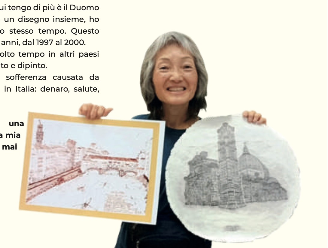 Per comprendere la particolarità di quest’artista, frequentatrice storica della Lazzerini e ‘senzatetto’, ci affidiamo alle sue stesse parole: “Sono un’artista e amo l’arte. Mi chiamo Mei Suk Leung. Sono nata il 23 marzo 1959 a Hong Kong con una rara allergia genetica. L’arte è nella mia natura. Prima ancora di imparare a camminare, ho iniziato a disegnare da sola. Nell’arte cerco di perseguire la bellezza estetica. Sono arrivata a Firenze nel 1997 e sono rimasta folgorata dall’arte rinascimentale. Ogni giorno ricevevo così tanta ispirazione e mi sentivo così rapita che dovevo smettere di camminare per disegnare immediatamente i bellissimi paesaggi e i suoi monumenti. Firenze è stata la mia università d’arte, ho disegnato dal vero in vari luoghi: nei musei, nelle piazze, nelle strade, ovunque. Alcune tecniche sono mie invenzioni. Uno dei lavori artistici a cui tengo di più è il Duomo di Firenze. È un rilievo e un disegno insieme, ho scolpito e disegnato allo stesso tempo. Questo lavoro mi ha richiesto tre anni dal 1997 al 2000. Dal 2011 ho trascorso molto tempo in altri paesi europei, dove ho disegnato e dipinto. A causa di una lunga sofferenza causata da malattie, ho perso tutto in Italia: denaro, salute, opportunità. Così sono diventata ‘senzatetto’, ma finora la mia passione per l’arte non è mai morta”.