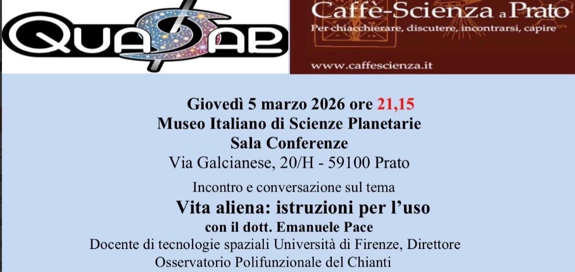 PRATO – Siamo soli nell’Universo? Partendo da questo interrogativo millenario, l’associazione astrologica Quasar e Caffè Scienza propongono per giovedì 5 marzo al Museo Italiano di Scienze Planetarie la serata “Vita aliena, istruzioni per l’uso”, con Emanuele Pace, docente di tecnologie spaziali dell’Università di Firenze e direttore dell’Osservatorio Polifunzionale del Chianti. Introducono Monica Menzogni dell’Associazione astronomica Quasar e Antonio Mauro di Caffè Scienza Firenze & Prato.
