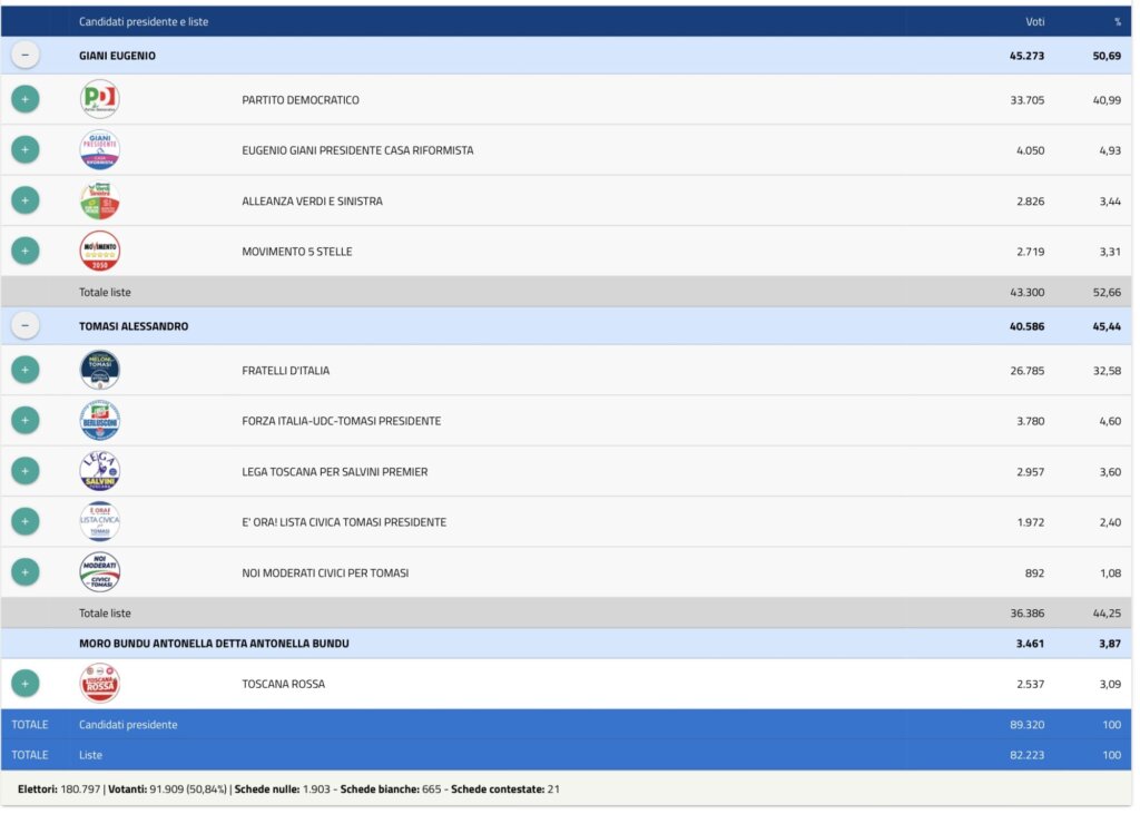 Per il centrodestra si attesta al primo posto Fratelli d’Italia (32,58%), secondo Forza Italia-Udc-Tomasi Presidente (4,60%) terzo Lega Toscana per Salvini Premier (3,60%), quarto E’ Ora! Lista Civica per Tomasi Presidente (2,40%). Chiude al sesto posto Noi Moderati Civici Per Tomasi (1,08%).