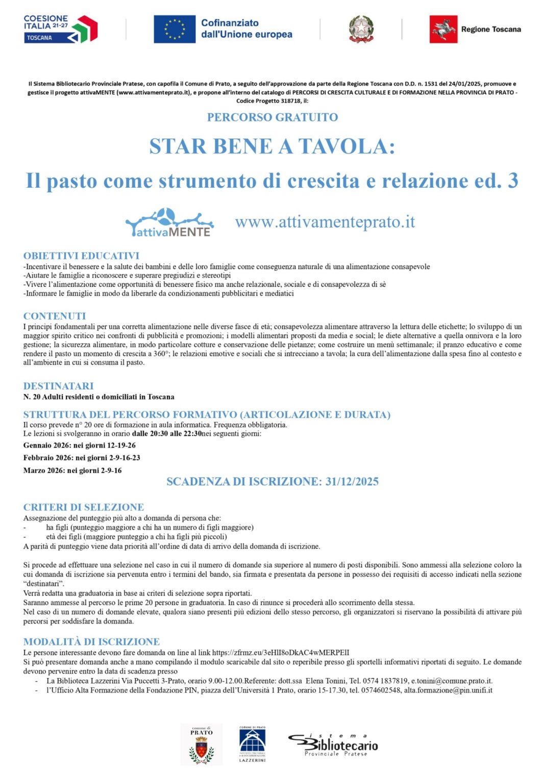 MONTEMURLO – Al Centro Giovani “David Sassoli” di piazza Don Milani a Montemurlo ritorna la terza edizione di “Star bene a tavola”, il percorso formativo gratuito promosso dal Sistema Bibliotecario Provinciale Pratese attraverso attivaMENTE (www.attivamenteprato.it).