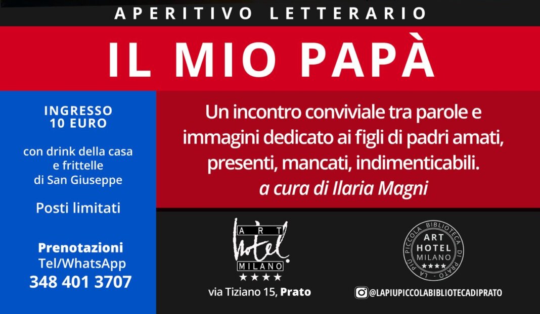 PRATO – Giovedì 19 marzo 2026, alle ore 18, all’Art Hotel Milano di Prato, in via Tiziano 15, appuntamento con “Il mio papà”, aperitivo letterario a cura di Ilaria Magni. La serata, tra parole e immagini, è pensata come un momento di ascolto e condivisione dedicato alla figura del padre: per chi lo ha accanto, per chi lo ha perduto, per chi continua a ritrovarlo nei ricordi.