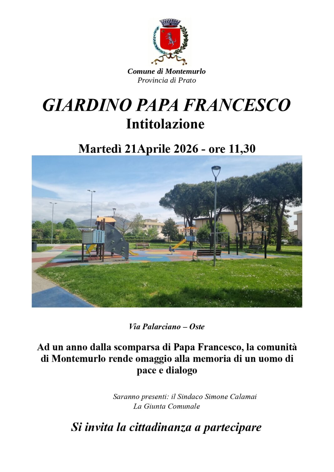 In un momento di forte instabilità internazionale, l’intitolazione di uno spazio pubblico a Papa Francesco vuol essere un richiamo alla pace e al dialogo. “Montemurlo è una città di pace. Ad un anno dal 21 aprile 2025, data della scomparsa di Papa Francesco, abbiamo ritenuto importante intitolare a questo grande pontefice il giardino di via Palarciano, sempre frequentato da tanti ragazzi, bambini e famiglie- dice il sindaco Calamai – Con questo semplice gesto vogliamo ribadire la nostra ferma condanna ad ogni forma di violenza e prepotenza come modalità per risolvere le controversie internazionali. Le parole di Papa Francesco contro la guerra siano un monito per tutti i potenti della Terra”. Alla cerimonia di intitolazione sono invitati a partecipare tutti i cittadini.