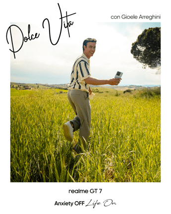 La campagna "Dolce Vita""Anxiety off, Life on" invita il pubblico a rallentare il ritmo frenetico della vita quotidiana per abbracciare momenti di pura bellezza e leggerezza. Attraverso la lente di realme GT 7 – presentato ufficialmente in occasione del lancio globale a Parigi il 27 maggio – la campagna racconta risvegli lenti, "golden hour" dorate e fughe spontanee fuori città, offrendo un'ode allo stile di vita italiano: elegante, rilassato e vibrante. L'atmosfera "slow" permea l'intero progetto, come filo conduttore della narrazione. La scelta delle location non è casuale: le immagini sono state scattate tra i suggestivi panorami naturali toscani della provincia di Siena e lungo la costa ligure, nei pressi di La Spezia. Questi scenari sono stati selezionati per celebrare e valorizzare la bellezza autentica del territorio italiano. Colori ricchi, ispirati al blu intenso del mare e al verde rigoglioso delle colline, avvolgono ogni scena, mentre musiche delicate e immagini di vita quotidiana immerse nella natura invitano lo spettatore a rallentare, a cogliere la bellezza dei dettagli e ad abbandonarsi al dolce ritmo della vita.  realme ha concepito questa iniziativa andando oltre la semplice diffusione sui social media. Grazie alla qualità degli scatti realizzati con realme GT 7 e all'attenzione meticolosa per la composizione e la luce, il progetto assume i connotati di una vera e propria campagna fotografica. Gli scatti, raccolti in una selezione curata, sono pensati per essere valorizzati anche in contesti espositivi, mostre e pubblicazioni dedicate, trasformando la narrazione estiva in un'esperienza visiva che trascende la fruizione digitale e diventa occasione di incontro e condivisione per tutti gli appassionati di fotografia.