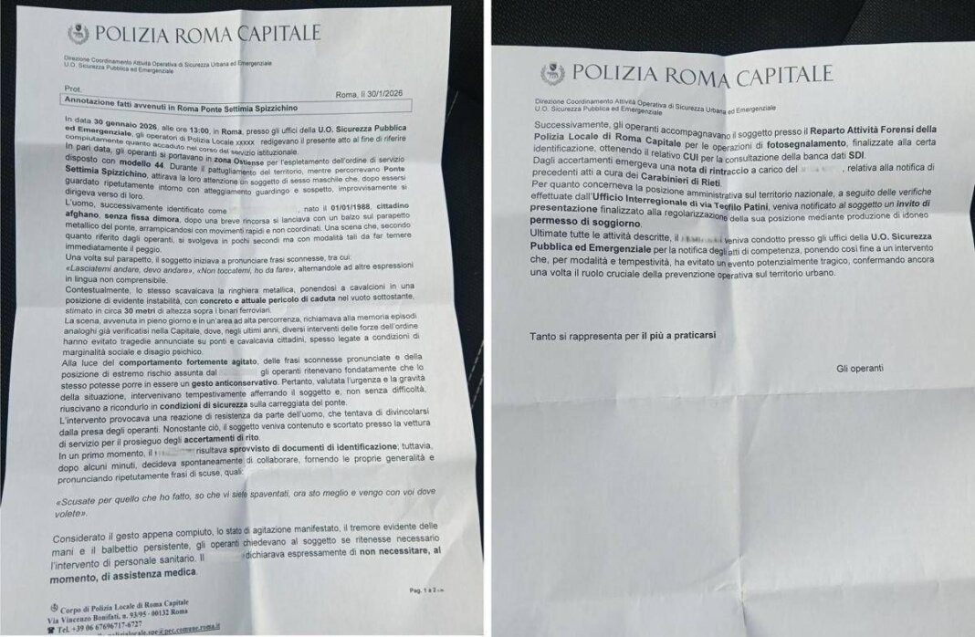 (Adnkronos) – Quello di questa mattina sul ponte Spizzichino a Roma, è stato “un intervento che, per modalità e tempestività, ha evitato un evento potenzialmente tragico, confermando ancora una volta il ruolo cruciale della prevenzione operativa sul territorio urbano”. É quanto si legge nella relazione, che l’Adnkronos ha potuto visionare, redatta dagli agenti della Polizia di Roma Capitale intervenuti per fermare un uomo, 38enne afghano, che questa mattina, alla loro vista, “si lanciava con un balzo sul parapetto metallico del ponte, arrampicandosi con movimenti rapidi e non coordinati”. Una scena che, “secondo quanto riferito dagli operanti – si legge – si svolgeva in pochi secondi ma con modalità tali da far temere immediatamente il peggio”.