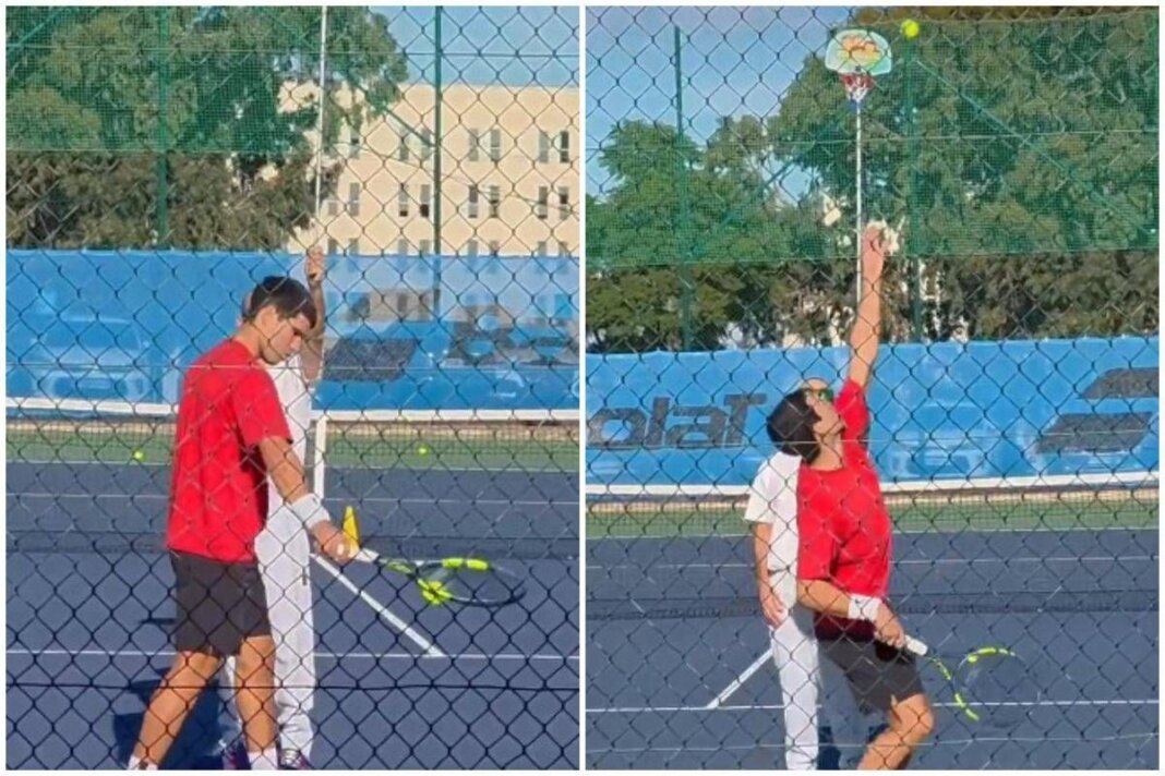 Un membro dello staff tecnico regge un’asta con in cima piccolo canestro: obiettivo far passare la pallina all’interno della retina. Un esercizio per migliorare distanze e precisione del lancio, che Alcaraz, stando al video diventato virale su X, non ha fatica a completare.