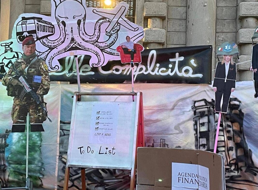 Sul palco allestito davanti a Palazzo Marino campeggiano i cartonati di “ladyMacLoni” (così è stata ribattezzata la premier dal nome della protagonista dell’opera che andrà in scena stasera alla Scala) e dei ministri con in testa un elmetto con le bandiere italiana, israeliana e Usa.