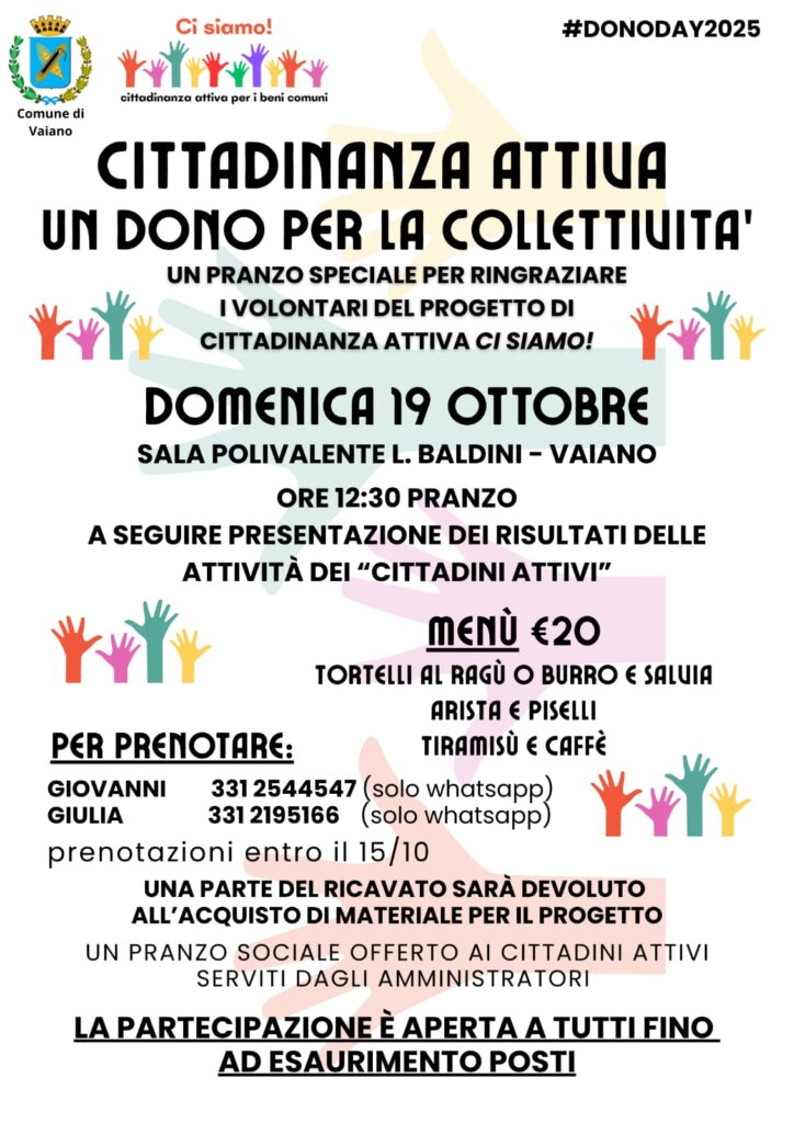 Il progetto Cittadinanza attiva – Ci siamo! è attivo a Vaiano dalla primavera 2025 e conta già oltre 80 volontari suddivisi in tre gruppi operativi a Vaiano, Sofignano e La Briglia. Si tratta di un’iniziativa regolata da un apposito patto di collaborazione tra Comune e cittadini volontari, che garantisce anche la copertura assicurativa per i partecipanti. Dall’avvio ha realizzato quasi un centinaio di interventi concreti, dalla pulizia di aree verdi al restauro di arredi urbani, dalla manutenzione di spazi pubblici all’affiancamento durante eventi culturali e scolastici. Tra i più recenti, quelli sulla scuola dell’infanzia della Tignamica e della primaria alla Briglia.