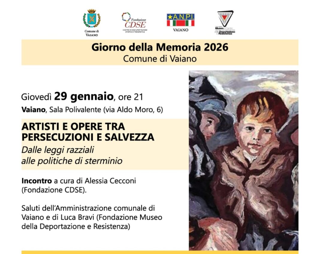 VAIANO – Il Comune di Vaiano celebra il Giorno della Memoria 2026 con due incontri di approfondimento e riflessione, realizzati con la consulenza scientifica della Fondazione Cdse e di Anpi Vaiano e con la collaborazione della Fondazione Museo della Deportazione e Resistenza di Figline.