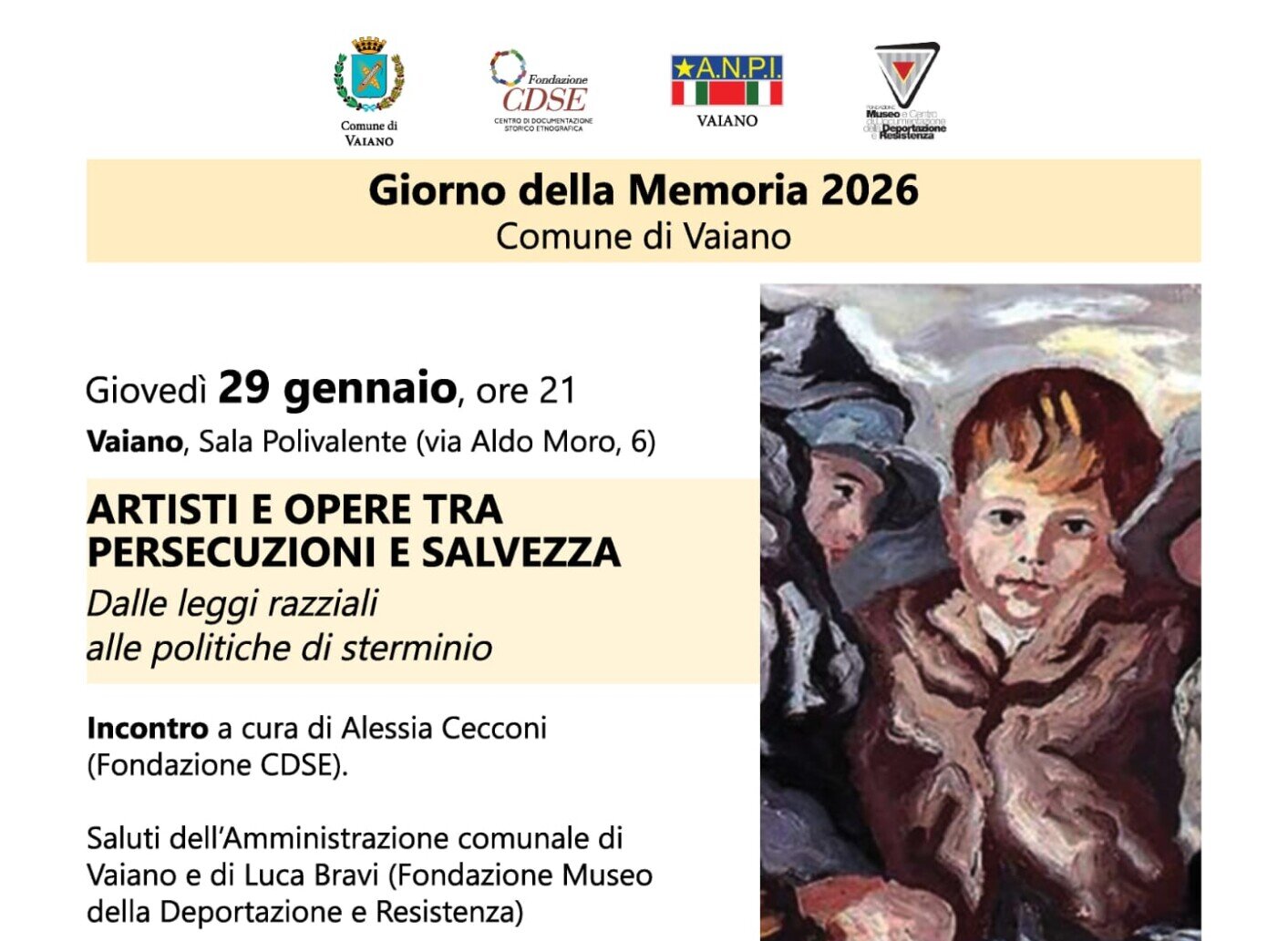 L’incontro, intitolato “Artisti e opere tra persecuzioni e salvezza. Dalle leggi razziali alle politiche di sterminio” si terrà dalle 21 nella Sala Polivalente di Vaiano (via Aldo Moro 6).