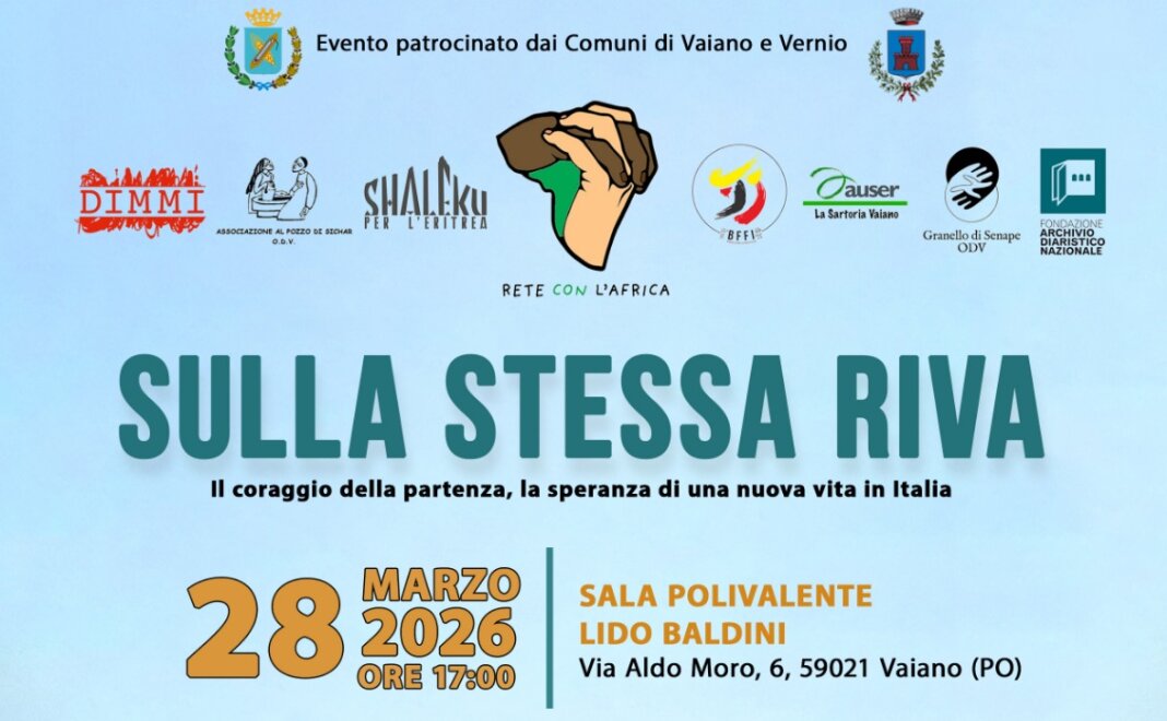VAIANO- Un’iniziativa dedicata all’ascolto, alla comprensione e al dialogo su un tema complesso e attuale come quello delle migrazioni. Sabato 28 marzo 2026 alle ore 17, nella Sala Polivalente Lido Baldini, si terrà “Sulla stessa riva”, promossa da Rete con l’Africa.