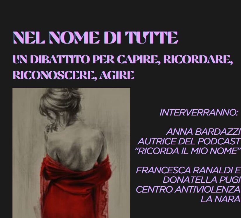VERNIO – Si intitola “Nel nome di tutte: un dibattito per capire, riconoscere, ricordare, agire”, l’evento organizzato dal Comune di Vernio insieme al centro antiviolenza La Nara. Venerdì 28 novembre alle 21 nella Sala Superiore del Meucci l’appuntamento con Francesca Ranaldi, direttrice del Centro Antiviolenza La Nara, Donatella Pugi, operatrice dello sportello di Vernio presso La Casa della Salute e Anna Bardazzi, autrice del podcast “Ricorda il mio nome”.